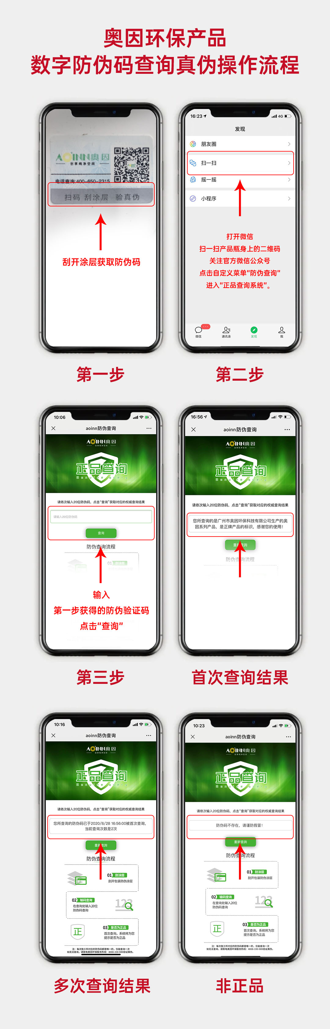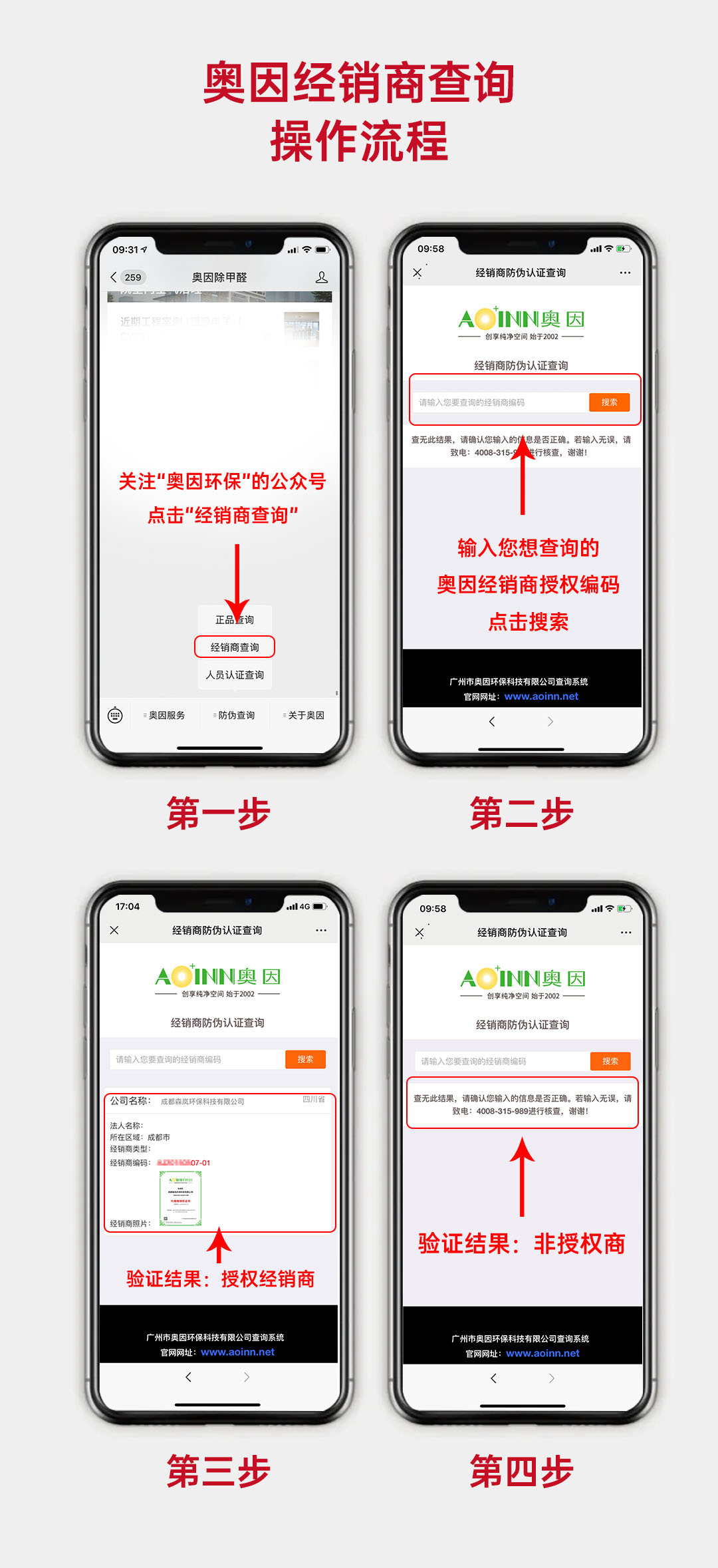 首先,關(guān)注奧因官方微信公眾號(hào)奧因環(huán)保;其次,在自定義菜單欄中找到“防偽查詢”,點(diǎn)擊即可進(jìn)入三重防偽系統(tǒng),根據(jù)網(wǎng)頁提示輸入相關(guān)信息,即可獲得查詢結(jié)果。
