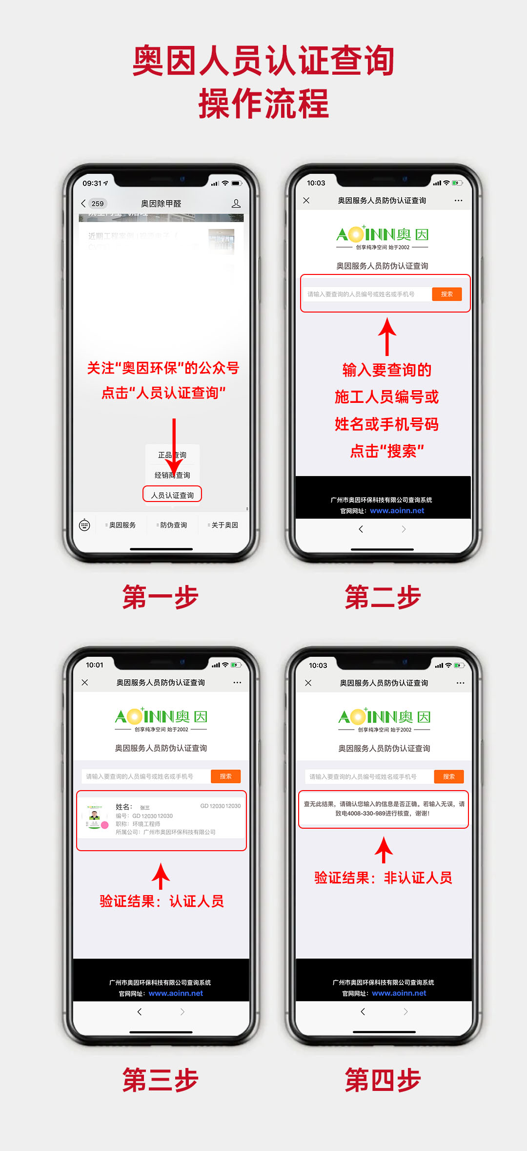 打開“奧因環(huán)?!蔽⑿殴娞?hào)的“人員認(rèn)證查詢”,輸入施工人員的姓名、手機(jī)號(hào)碼或施工證件編號(hào),均可驗(yàn)證施工人員是否為奧因認(rèn)證。